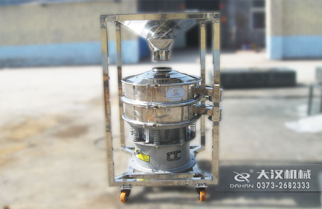 本品大漢公司研制的移動式料倉篩粉機,底部加裝可移動式萬向輪,帶進料倉,可將物料一次性裝滿料倉,然后通過調節(jié)料倉上的蝶閥控制物流進入振動篩的流量進行篩分,本品的特點間歇性加料,不用工人不間斷投料節(jié)省人工,蝶閥控制流量大小能提高篩分精度,同時可將振動篩移動作業(yè),滿足不同地點的工作需要。