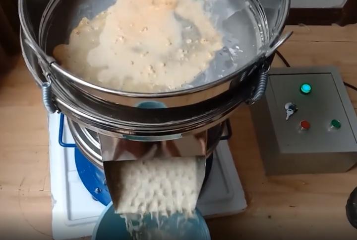 過濾篩工作時(shí),物料從進(jìn)料口進(jìn)入篩機(jī)內(nèi),由重錘帶動(dòng)振動(dòng),在篩網(wǎng)上做水平、垂直、傾斜的三維運(yùn)動(dòng),在篩網(wǎng)上拋起并由中心向外旋轉(zhuǎn)至出料口排出。