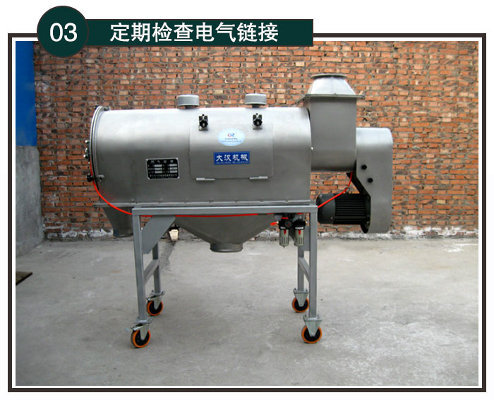 氣旋篩粉機要定期檢查電汽連接,如地線連接、電源開關是否完好,如果電氣出現老化等間題,應及時維修或更換,道免因電氣間題導致設備損壞,甚至更大的危險隱患;