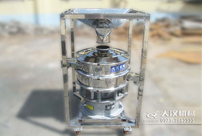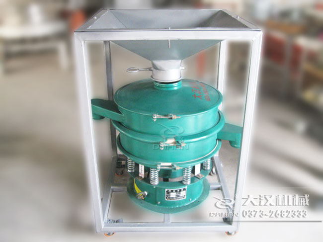 本品大漢公司研制的移動式料倉篩粉機,底部加裝可移動式萬向輪,帶進料倉,可將物料一次性裝滿料倉,然后通過調節(jié)料倉上的蝶閥控制物流進入振動篩的流量進行篩分,本品的特點間歇性加料,不用工人不間斷投料節(jié)省人工,蝶閥控制流量大小能提高篩分精度,同時可將振動篩移動作業(yè),滿足不同地點的工作需要。