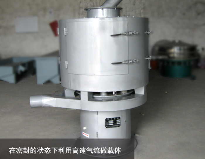 氣流篩粉機(jī)是在,傳統(tǒng)的重力勢(shì)能的作業(yè)原理的基礎(chǔ)上開(kāi)辟了利用流動(dòng)體的篩分特性,其主要工作原理是在密封的狀態(tài)下利用高速氣流做載體,使充分?jǐn)U散的粉料微粒以足夠大的動(dòng)能向篩網(wǎng)噴射 , 達(dá)到快速分級(jí)之目的。微細(xì)粉物料經(jīng)進(jìn)料斗流人進(jìn)料斗口,立即擴(kuò)散并與空氣混合成霧狀, 經(jīng)旋轉(zhuǎn)風(fēng)輪的作用,呈旋風(fēng)狀噴射過(guò)網(wǎng),在引風(fēng)機(jī)的作用下,氣體與細(xì)粉全部進(jìn)人沉降室,成品細(xì)粉沉降后由下部排出 , 帶有少量粉塵的氣體進(jìn)人除塵布袋 ,經(jīng)凈化后排出袋外。顆粒直徑大于網(wǎng)孔的物料不能過(guò)網(wǎng),落人篩盤(pán)內(nèi)由排渣口排出機(jī)外。