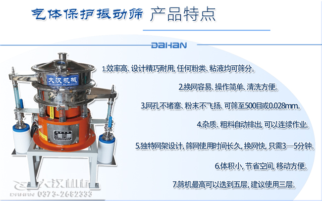 氣體保護旋振篩是大漢機械新研發(fā)的新型篩分設備,引進德國先進技術,采用304不銹鋼材質,氣體保護軟管,防靜電裝置等制作而成。氣體保護旋振篩型號是從φ400-φ1800mm直徑,氣體保護旋振篩價格根據材質和直徑大小、層數價格不同。